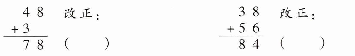 ①相同数位没有对齐。 ②十位没有加上个位进上来的“1”。