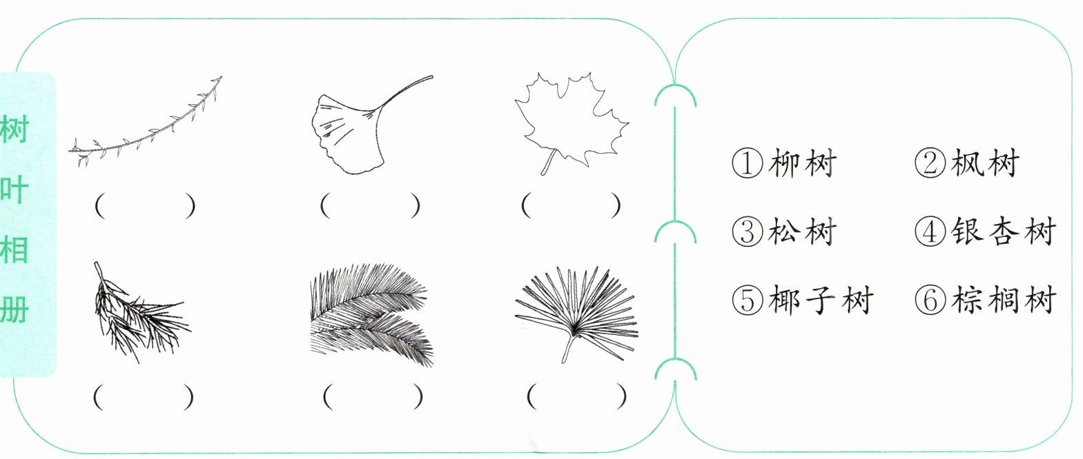 一、认识树叶 这是哪些树的叶子?填一填,回答问题。(填序号)