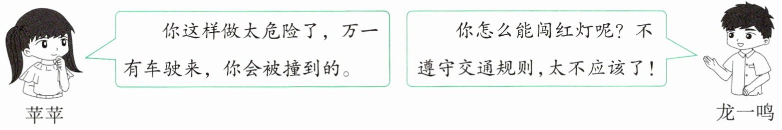 二、放学了,丁丁准备过马路。红灯亮了,他因为着急回家,想趁着路上没车赶紧过马路。下面两个同学对他进行了劝告,你赞同谁的说法呢?