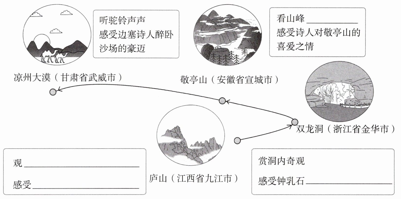 (示例)敬亭山:挺立 双龙洞:形状的变化多端 庐山:云雾缭绕 庐山的神秘莫测 庐山 双龙洞 敬亭山 凉州大漠
