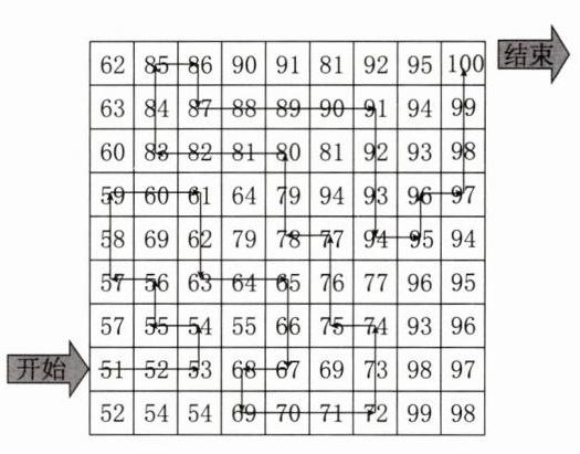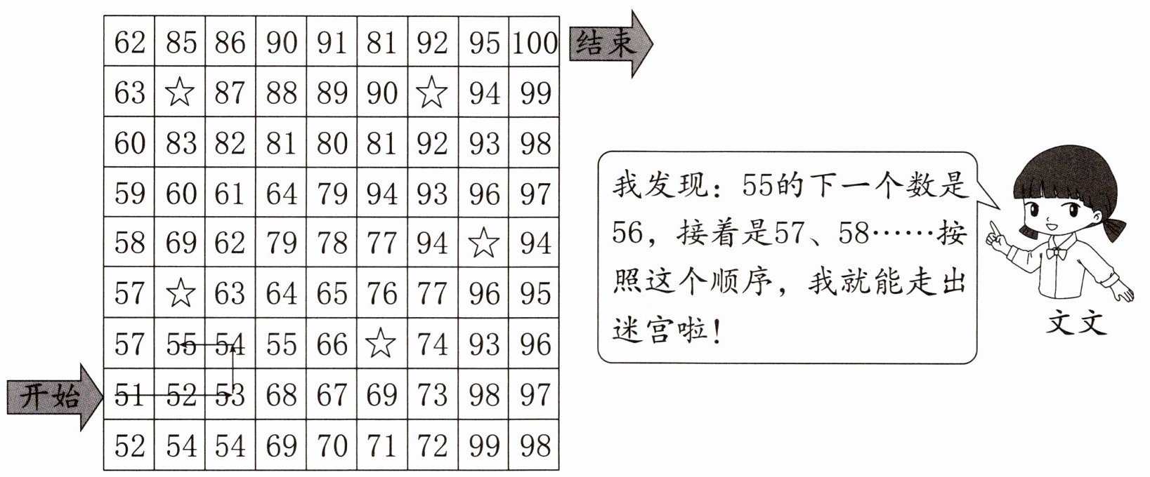 文文不小心在数字迷宫阵里迷路了,你愿意帮一帮她吗?要按照从 51 到 100 的顺序走,遇到☆处要填一个数才能通过。