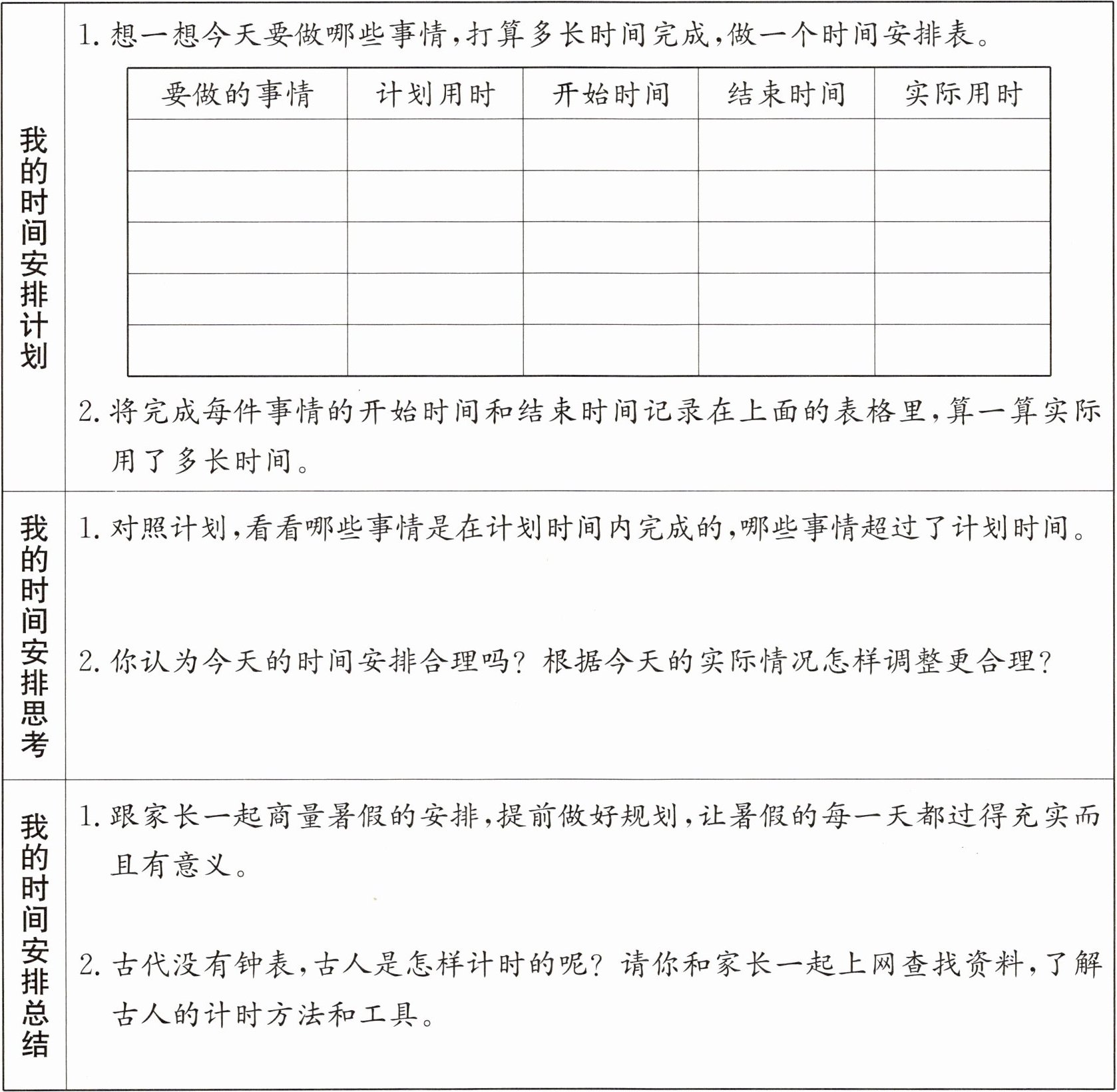 |2. 将完成每件事情的开始时间和结束时间记录在上面的表格里,算一算实际用了多长时间。
