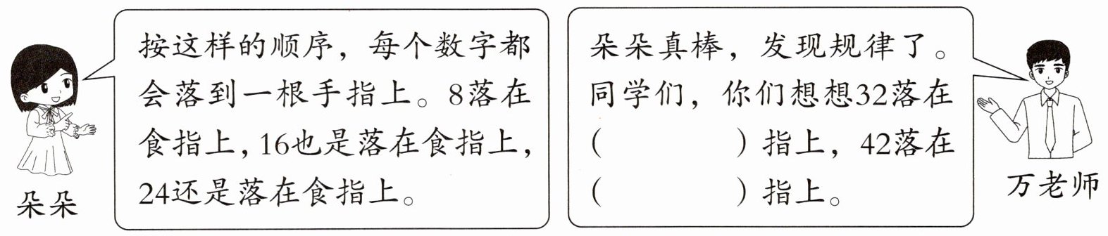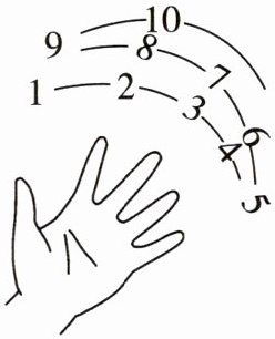 游戏规则:请伸出你们的左手,从大拇指开始数起,1、2、3、4,数到小指为5,接下来往回数,无名指为6,中指为7,食指为8,大拇指为9,食指为10。