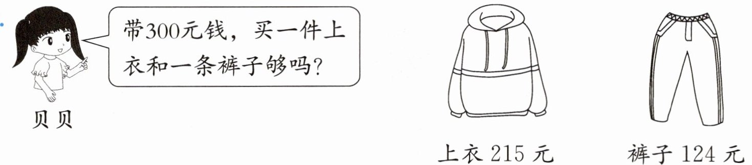 因为 215 > 200 ,124 > 100 ,215 + 124 > 200 + 100 = 300 ,所以贝贝带 300 元钱买一件上衣和一条裤子不够。