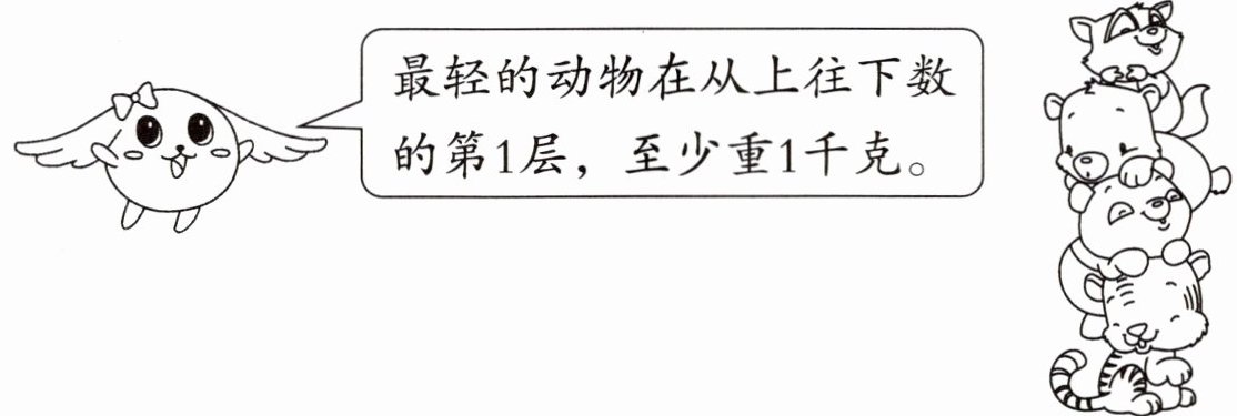 动物们在玩叠罗汉的游戏。每只动物的质量都不同而且都是整千克数,最轻的重 1 千克。