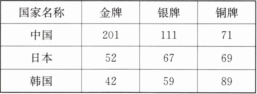 2. 下表是第19届亚运会部分国家奖牌榜情况。(单位:枚)