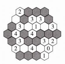 右图中每一个六边形中的数字指的是与其相邻且需要涂灰的六边形的数量。请你将其中不含数字的六边形涂灰,直到所有被涂灰的六边形都能正确地围绕着含有数字的六边形。