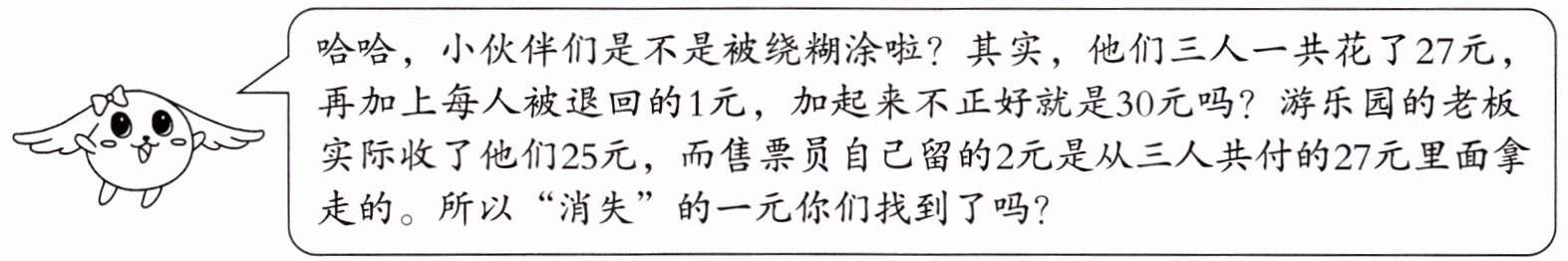 【答案】:不存在“消失的一元”,是计算逻辑错误。按照正确逻辑,$25$元(老板收的门票钱)$+$$2$元(售票员私留)$+$$3$元(三人退回)$ = 30$元。