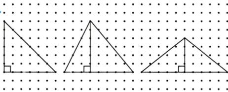 2. 在下面的点子图上分别画一个等腰直角三角形、一个锐角三角形和一个钝角三角形,并分别画出每个三角形的一条高。