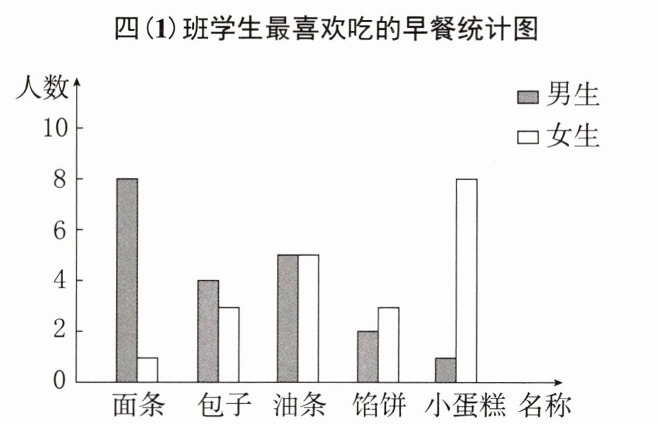 观察女生对应的条形,“面条”对应的条形最低,所以女生最喜欢吃**面条**的人数最少。
