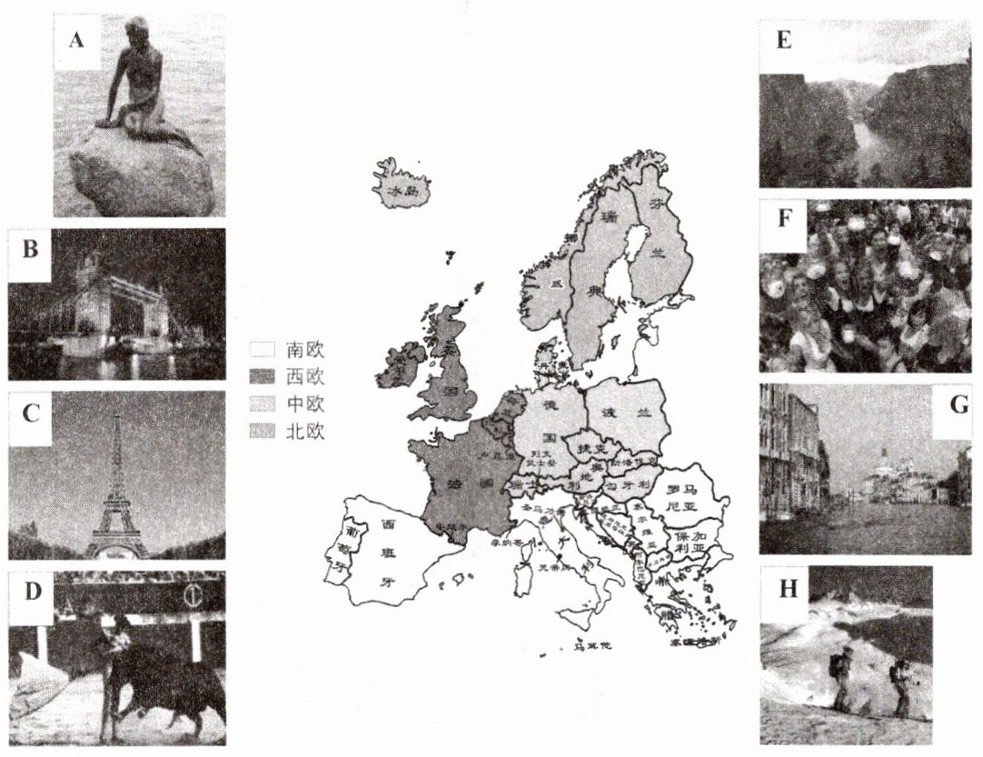 1. A—丹麦;B—英国;C—法国;D—西班牙;E—挪威;F—德国;G—意大利;H—瑞士。