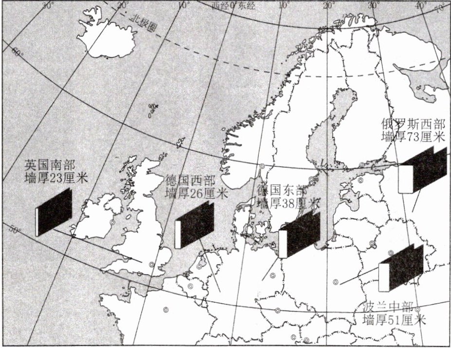(1)英国南部至俄罗斯西部,传统民居墙壁的厚度逐渐