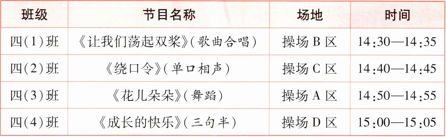 六、东风小学组织校园文化节展演活动。以下是四年级各班展演的安排表,请阅读后回答问题。