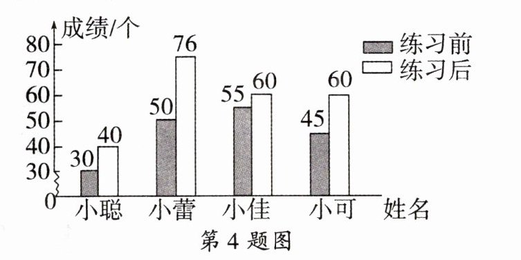 4. 如图是4名同学练习踢毽子的前后成绩统计图。