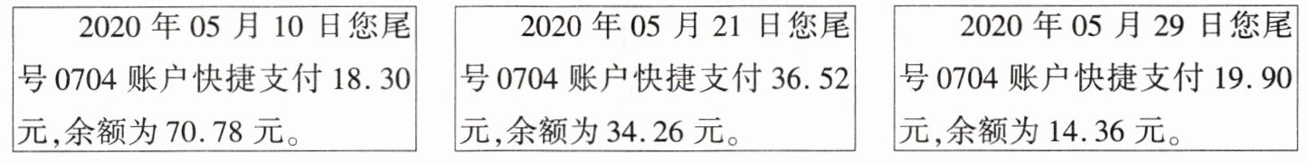 4. 为了方便,王阿姨开通了手机银行,每月的生活缴费开支都会从她的手机银行里自动扣除。下面是王阿姨5月份收到的短信提醒。王阿姨家5月份的生活缴费支出共多少元?