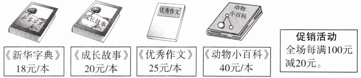 (1)如果买4本《新华字典》和1本《动物小百科》,应付多少钱?