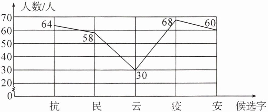 二、“汉语盘点 2020”活动确定了前五位的年度候选字。候选字有:抗、民、云、疫、安。班主任苗老师在班级群里发了一张调查表,统计家长对这五个字的了解情况。下图是家长了解这五个候选字的人数统计图。