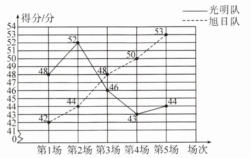三、下图是光明篮球队和旭日篮球队的五场比赛得分情况统计图。