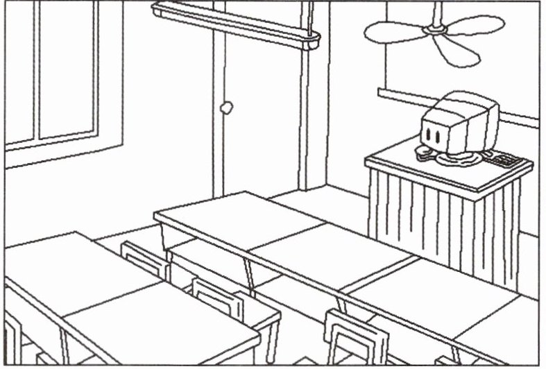 门和窗户涂棕色,风扇涂绿色,墙涂粉色,黑板涂黑色,讲桌涂橙色,电脑涂白色,课桌和椅子涂黄色,灯涂蓝色。
