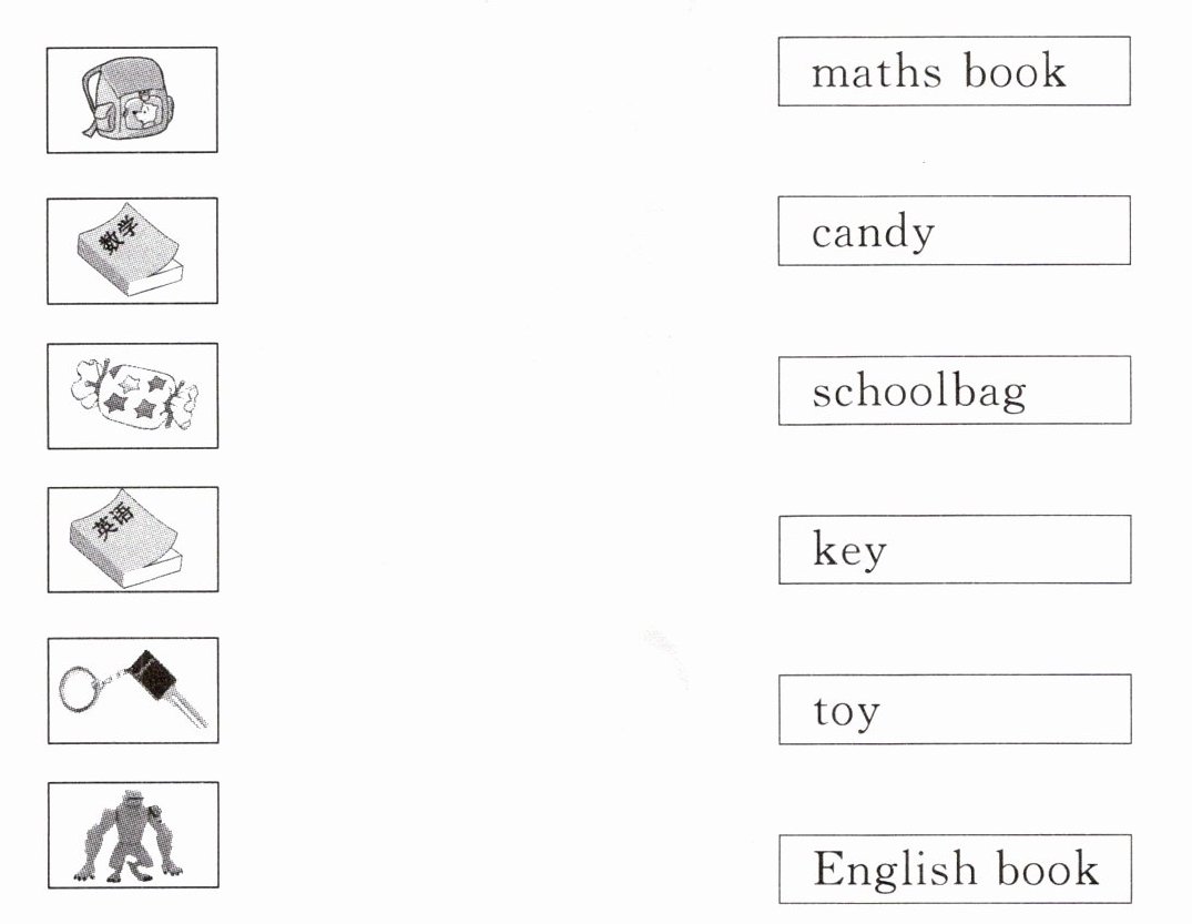 第一幅图连“schoolbag”;第二幅图连“maths book”;第三幅图连“candy”;第四幅图连“English book”;第五幅图连“key”;第六幅图连“toy”。