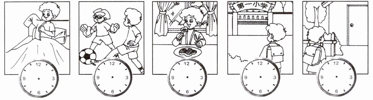 四、Read, draw and tick or cross. 读短文,给钟面画上时针和分针,再判断正误。