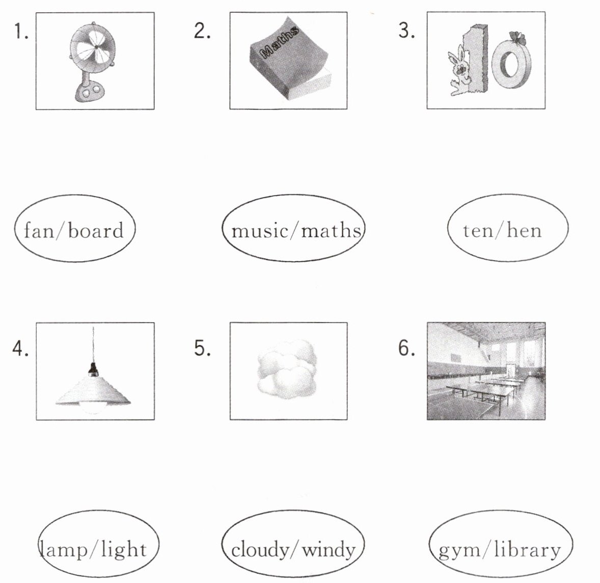 1. fan 2. maths 3. ten 4. light 5. cloudy 6. gym