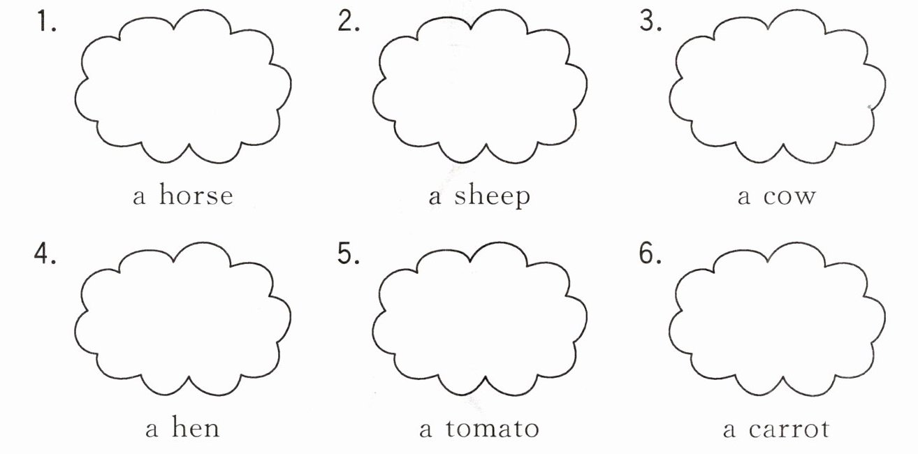 根据对每个英文单词的理解,在相应框内画出马、绵羊、奶牛、母鸡、西红柿、胡萝卜(由于是绘画题,这里用文字表述答案内容)。