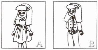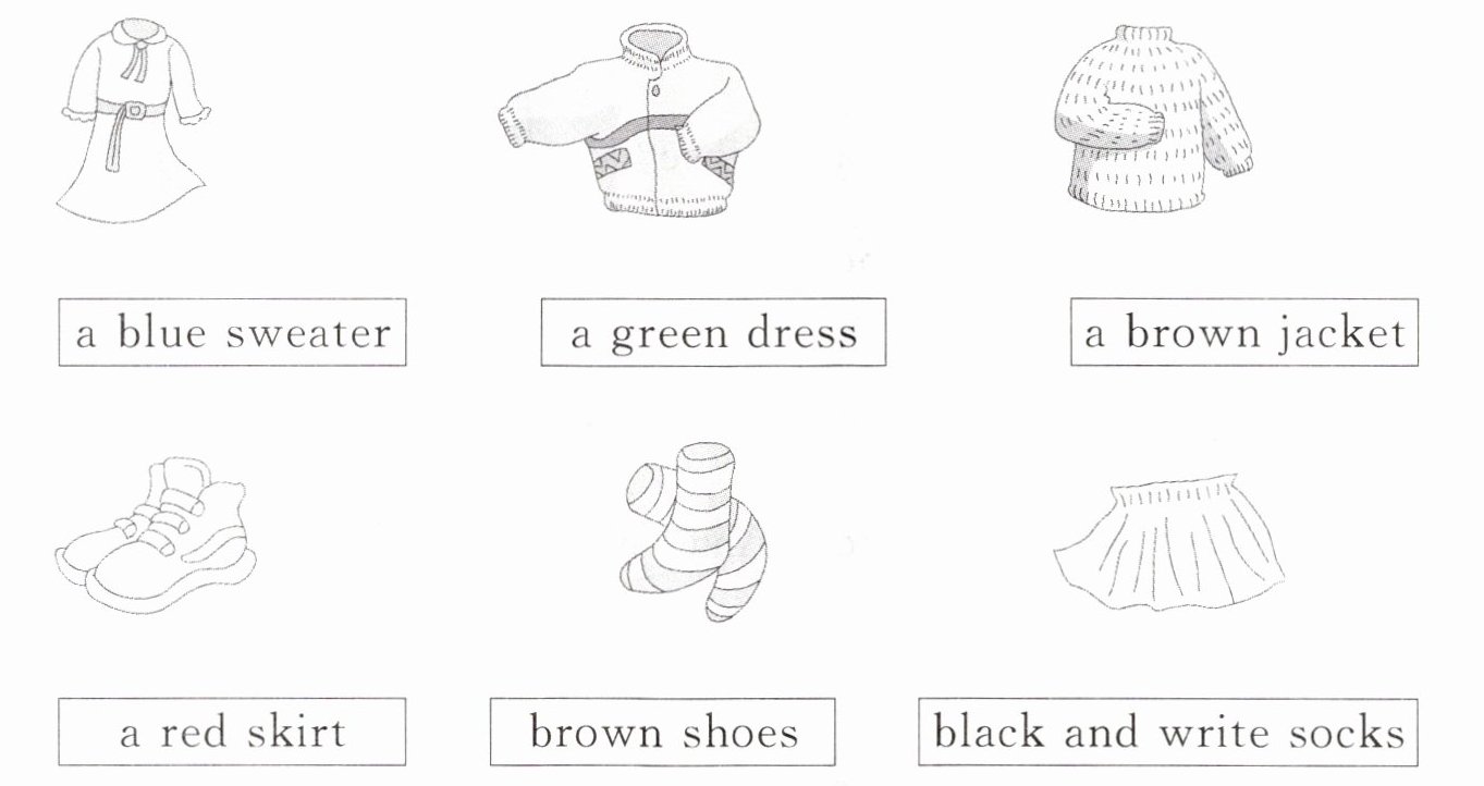 第一排左一与“a green dress”相连;第一排左二与“a brown jacket”相连;第一排左三与“a blue sweater”相连;第二排左一与“brown shoes”相连;第二排左二与“black and white socks”相连;第二排左三与“a red skirt”相连。(涂色部分按照英文描述颜色涂,如“a green dress”把连衣裙涂成绿色等)
