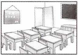 B. A door, a blackboard, a teacher's desk and many desks and chairs.