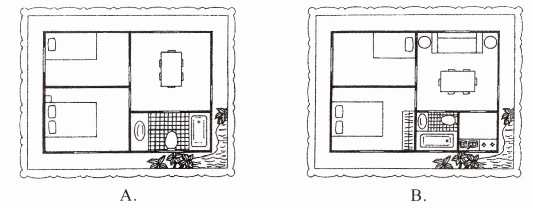 I want a house. There is a lake and many trees near the house. There are two bedrooms. There is a living room, a kitchen and a bathroom in the house. I also want some furniture(家具). I want two beds, a table, a sofa, and some chairs.
