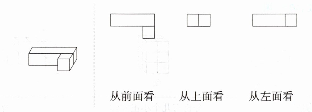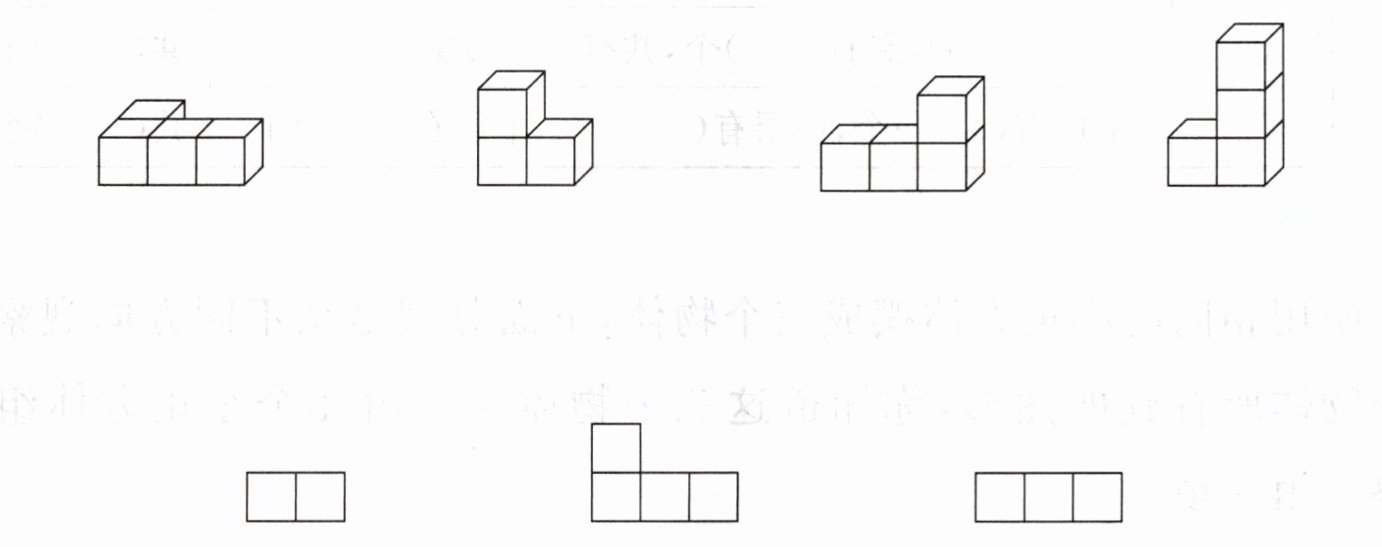 1. 把一个长方体和一个正方体摆成左图形状。右面的图形分别是从什么位置看到的?请你连一连。