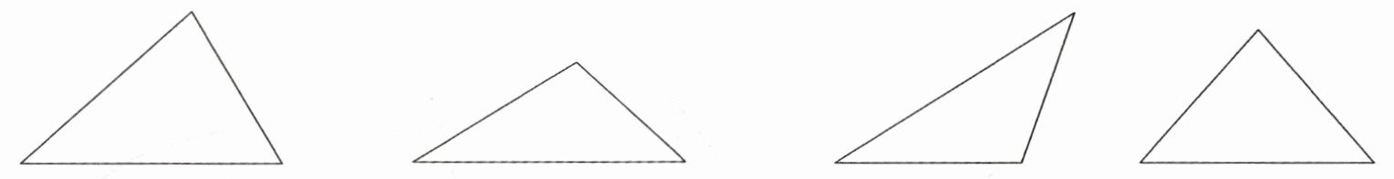 (由于无法直接绘制,这里用文字描述画法)第一个三角形(锐角三角形):用三角板的一条直角边与底边重合,另一条直角边经过顶点,沿着这条直角边从顶点到底边画线段,即为高。第二个三角形(等腰三角形):用三角板的一条直角边与底边重合,另一条直角边经过顶点(因为等腰三角形底边上的高、中线、角平分线三线合一),沿着这条直角边从顶点到底边画线段,即为高。第三个三角形(钝角三角形):以钝角所对的边为底边,将三角板的一条直角边与底边延长线重合,另一条直角边经过钝角顶点,沿着这条直角边从顶点向底边延长线画线段,即为这条边上的高;另外两条边对应的高,用三角板的一条直角边与边重合,另一条直角边经过对顶点,从顶点向对边画线段得到高。第四个三角形(锐角三角形):用三角板的一条直角边与底边重合,另一条直角边经过顶点,沿着这条直角边从顶点到底边画线段,即为高。(具体图形的高以实际操作为准,画法原理如上)