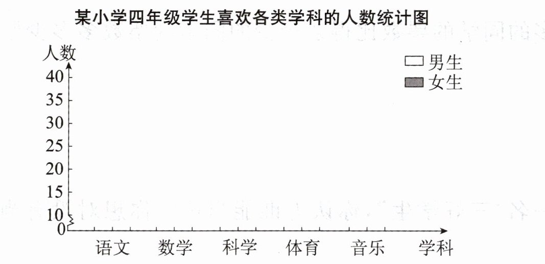 三、某小学四年级学生喜欢各类学科的人数情况如下表。根据统计表把统计图补充完整,并回答问题