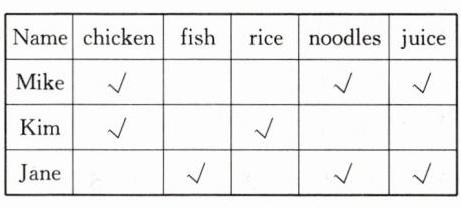 Mike: I'd like some noodles and chicken. I'd like a cup (杯) of orange juice.