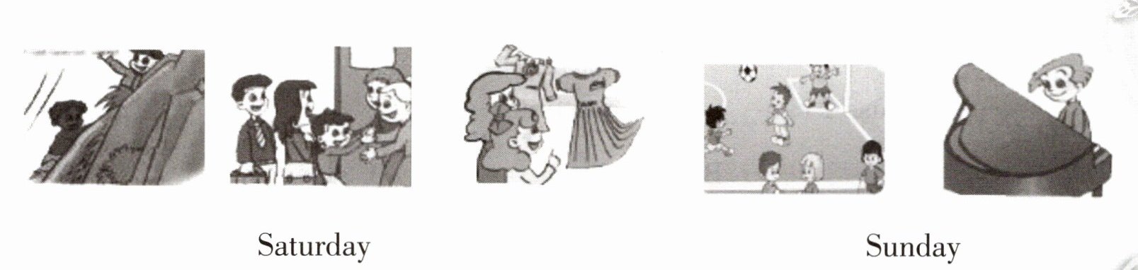 仔细观察图画,写一段不少于 5 句话的短文,说说你在周末做的事情。