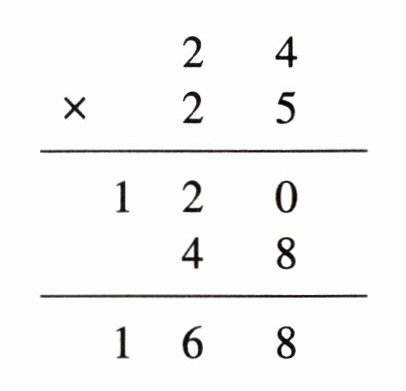 $\begin{array}{r}\quad\quad24\\\times\quad25\\\hline\quad\quad120\\\quad\quad48\quad\\\hline\quad\quad600\\\end{array}$