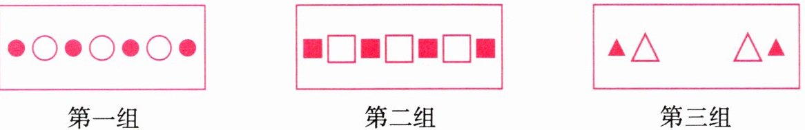 1. 仔细观察下图,找找变化规律,猜猜在第三组的空白方格内应填一个什么样的图形。