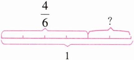 【解析】:把整体“$1$”看作单位“$1$”,已知其中一部分是$\frac{4}{6}$,求另一部分,用减法计算,即$1-\frac{4}{6}$。同分母分数相减,分母不变,分子相减,$1=\frac{6}{6}$,$\frac{6}{6}-\frac{4}{6}=\frac{6 - 4}{6}=\frac{2}{6}$。