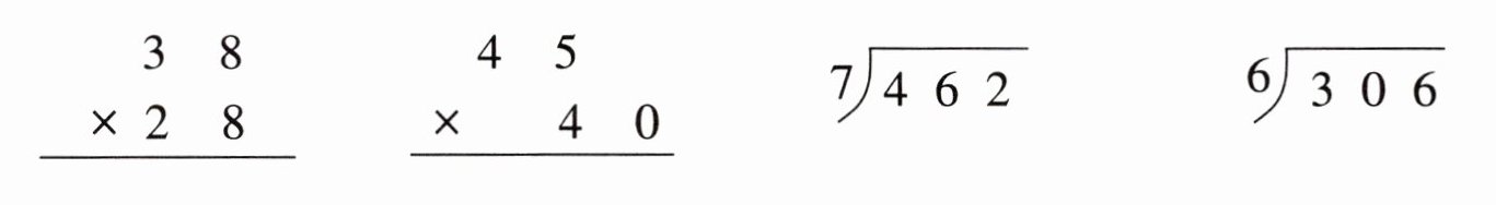 也可以用竖式计算:先用$28$个位上的$8$去乘$38$,$8\times38 = 304$;再用$28$十位上的$2$去乘$38$,$20\times38 = 760$;最后将两次的积相加,$304+760 = 1064$。