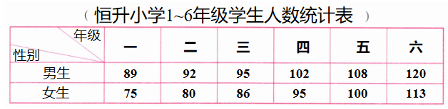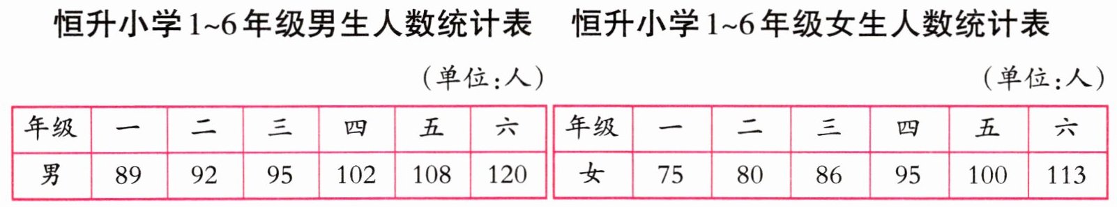 【解析】:首先,我们需要分别计算出每个年级男生和女生人数的差值。对于一年级,用男生人数$89$减去女生人数$75$,即$89 - 75 = 14$人;二年级,男生人数$92$减去女生人数$80$,得到$92 - 80 = 12$人;三年级,$95 - 86 = 9$人;四年级,$102 - 95 = 7$人;五年级,$108 - 100 = 8$人;六年级,$120 - 113 = 7$人。然后,对这些差值进行比较大小,$14>12>9>8>7$。