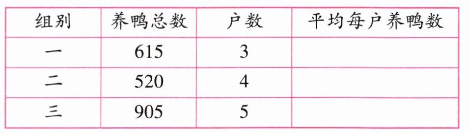 【解析】:根据“平均每户养鸭数 = 养鸭总数÷户数”来计算表格中平均每户养鸭数。第一组平均每户养鸭数为$615\div3 = 205$;第二组平均每户养鸭数为$520\div4 = 130$;第三组平均每户养鸭数为$905\div5 = 181$。可以提出的数学问题如:三个组平均每户养鸭数最多的比最少的多多少只。解答为:平均每户养鸭数最多的是第一组$205$只,最少的是第二组$130$只,$205 - 130 = 75$只。