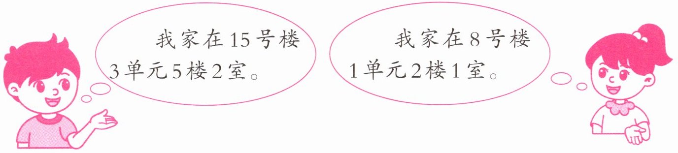 一、某小区有28栋住宅楼,小区为每家住户编了门牌号。如“032401”表示3号楼2单元4层1室。请你写出小刚和小芳家的门牌号。