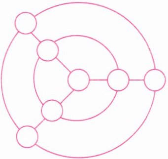 请你将数字1,2,3,4,5,6,7填到右图所示的小圆圈里,使每个圆周上的三数之和与每条线上的三数之和相等。