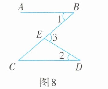 6. 如图8,$AB// CD$,点E在线段BC上,若$∠1 = 40°,∠2 = 30°$,则$∠3 =$____.