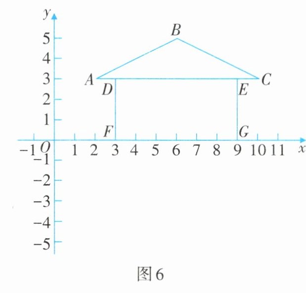 对于点$A$,过$A$向$x$轴作垂线,垂足对应的$x$轴坐标是$2$,向$y$轴作垂线,垂足对应的$y$轴坐标是$3$,所以$A(2,3)$;同理可得$B(6,5)$,$C(10,3)$,$D(3,3)$,$E(9,3)$,$F(3,0)$,$G(9,0)$。