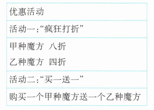 (2)结合社员们的需求,社团决定购买甲、乙两种魔方共 100 个(其中甲种魔方不超过 50 个),某商店的两种优惠活动如上表所示,根据信息,社团选择活动一的优惠办法购买魔方较实惠. 请求出该社团最多能购买多少个甲种魔方.