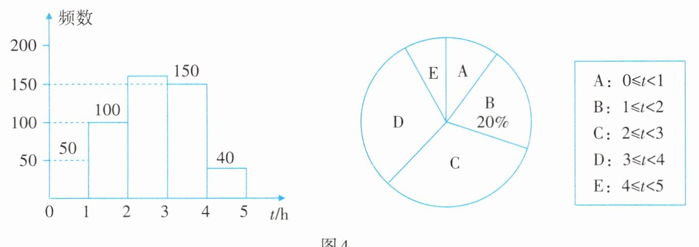 1. 某市为了解初中生每周阅读课外书籍时长t(单位:h)的情况,在全市范围内随机抽取了n名初中生进行调查,并将所收集的数据分组整理,绘制了如图4所示的不完整的频数分布直方图和扇形统计图.