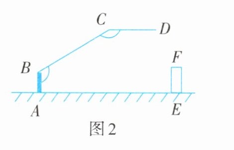 2. 如图2是某小区车库门口的曲臂直杆道闸模型。已知AB垂直于水平地面AE。当车牌被自动识别后,曲臂直杆道闸的BC段将绕点B缓慢向上抬高,CD段则一直保持水平状态上升(即CD与AE始终平行),在该运动过程中$∠ABC+∠BCD$的度数始终等于( )。