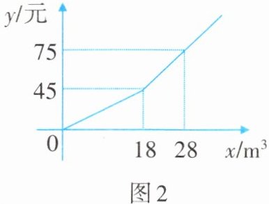 1. 某市规定了每月用水$18m^{3}$以内(含$18m^{3}$)和用水$18m^{3}$以上两种不同的收费标准。该市的用户每月应交水费$y$(元)与用水量$x(m^{3})$的函数关系如图2所示。