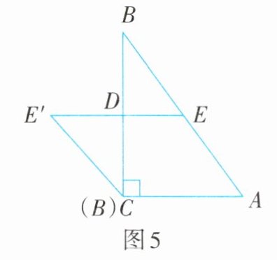 3. 如图5,D,E分别是直角三角板纸片ABC的边BC,AB的中点,沿线段DE剪开后,在平面上将△BDE绕着CB的中点D逆时针旋转180°,点E到了点E'的位置,则四边形ACE'E的形状是______。